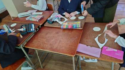 2月17日(金)のひまわりタイムは、ぶんぶんごまを作りました。厚紙の円を二つ切り、貼り合わせて好きな絵をかきました。ひもを通してできあがり。
