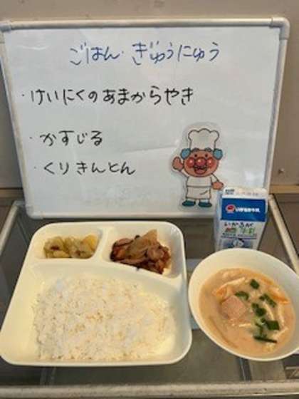 今日の給食献立は、「鶏肉の甘辛焼き」「かす汁」「くりきんとん」「ごはん」「牛乳」でした。