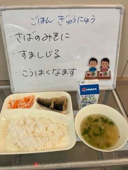 今日の給食献立は、「さばのみそ煮」「すまし汁」「紅白なます」「ごはん」「牛乳」でした。