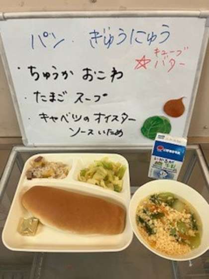 今日の給食献立は、「中華おこわ」「卵スープ」「キャベツのオイスターソースいため」「パン」「牛乳」でした。
