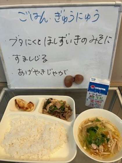 今日の給食献立は、「豚肉と干しずいきのみそ煮」「すまし汁」「あげ焼きじゃが」「ごはん」「牛乳」でした。