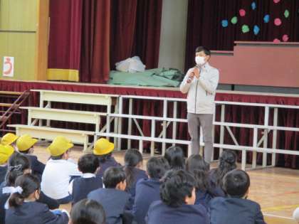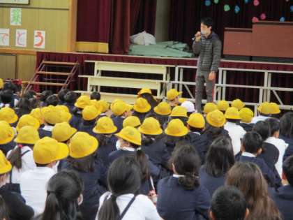 警察の方が、犯人役となり、みなさんは教室で先生の指示に従いました。