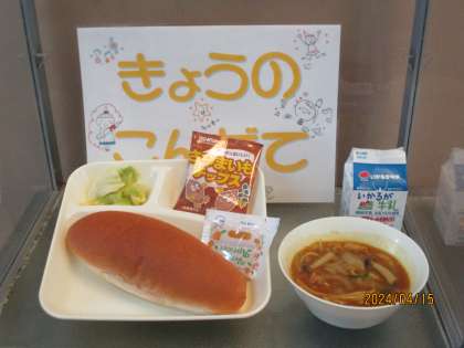 カレースープスパゲッティ、キャベツのピクルス、おさつチップス