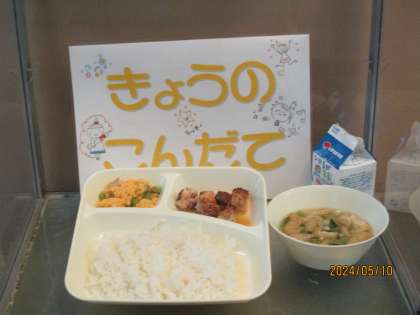 さけのごまみそ焼き、五目汁、えんどうの卵とじ
