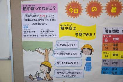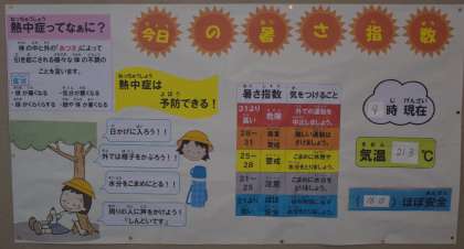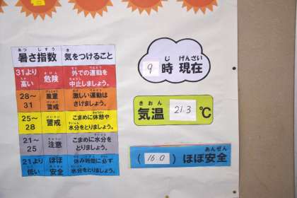 No quadro de avisos em frente à sala de saúde, você pode verificar facilmente o "índice de calor". Não se descuide só porque ainda é maio, e tome cuidado com a insolação