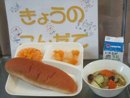 豚肉と野菜のカレースープ煮は豚肉のうまみがカレースープに溶けていてとてもおいしかったです。変わりピザはチーズがよく溶けていて、ピザソースとの相性も抜群でおいしかったです。ミックスフルーツはいろいろなフルーツがゴロゴロ入っていて甘くておいしかったです。今日もおいしくいただきました。