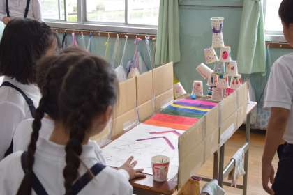 4年1組はペットボトルのキャップを使ってゲームします。紙コップを積み上げた的にキャップをあてて紙コップをたおします。うまく当たるとたくさんの紙コップがたおれます。