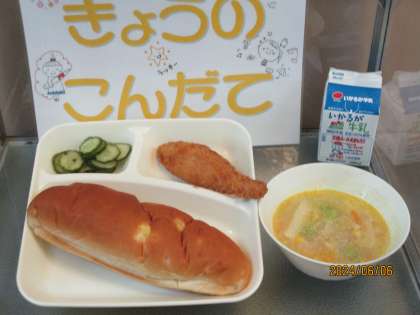 サーモンフライ、豆乳スープ、キュウリのバジル風味サラダ