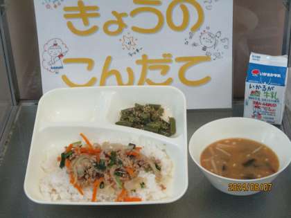 豚ひき肉とにらのそぼろ丼、ジャガイモの味噌汁、さんどまめのごまあえ