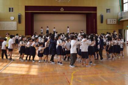 La "Asamblea de Niños" de hoy es "Tren de piedra, papel o tijera". Grupos de alumnos de 1º a 6º de primaria se forman en fila. Las dos primeras personas juegan a "piedra, papel y tijera". El grupo perdedor se alinea detrás del grupo ganador. Estuvo lleno de diversión y sonrisas.