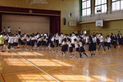 今日の「児童集会」は「じゃんけん列車」です。ハローグループで一列に並びます。先頭の人どうしで「じゃんけん」をします。負けたグループは勝ったグループの後ろに並びます。「じゃんけん」の時には歓声が響いていました。
