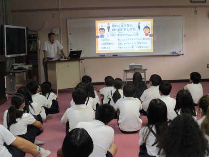今日は西淀川警察署からお巡りさんが来られ、『非行』についてお話をして頂きました。