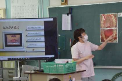 Học sinh lớp hai học cách đánh răng từ nhân viên vệ sinh răng miệng. Tôi đã tìm hiểu về răng hàm của răng vĩnh viễn, là loại răng dễ bị sâu. Sau đó, tôi được dạy cách đánh răng và tôi đã thực sự thử đánh răng. Tôi hy vọng từ bây giờ tôi có thể đánh răng đúng cách.