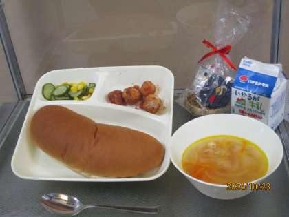 マグロのオーロラ煮、スープ、キュウリとコーンのサラダ