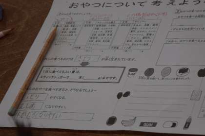 The fourth graders' dietary study (nutrition guidance) focused on "snacks." The fourth graders discussed what kind of snacks they usually eat. The snacks they eat contain a lot of sugar. Taking in too much sugar can be bad for your body. Therefore, they learned that it is better to eat fruits instead.