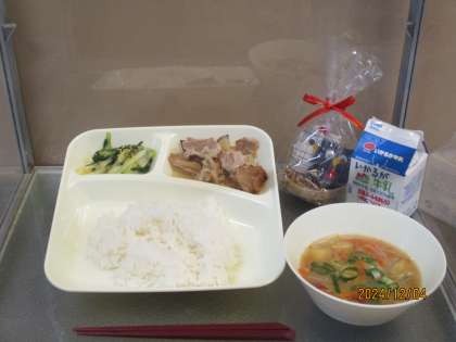 豚肉の生姜焼き、サツマイモの味噌汁、菊菜と白菜のごま和え