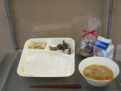 イワシの生姜煮、みそ汁、高野どうふの煮物