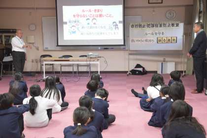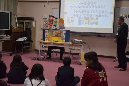 「梅田サポートセンター」の方に来ていただき、ルールを守ることの大切さのお話を聞きました。その後、ルールを守らずに万引きをしてしまったらどうなるのか。人形劇をみて考えました。
