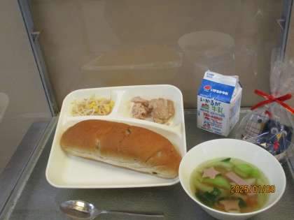 今年一発目の給食のメニューは鶏肉のから揚げ、ハムと野菜のスープ、もやしとコーンの中華和えです。