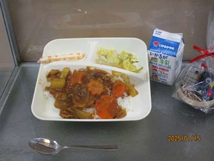 豚肉と金時豆のカレーライス、はくさいのピクルス、棒チーズ