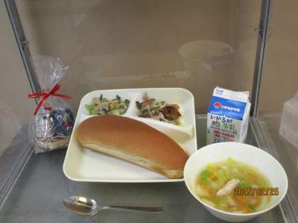 豚肉のオイスターソース焼き、中華スープ、ツナとチンゲンサイの炒め物
