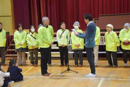 Every morning, local people who watch over the children safely on their way to school were invited to the school, and the sixth graders gave speeches of thanks and the principal presented them with a letter of appreciation.