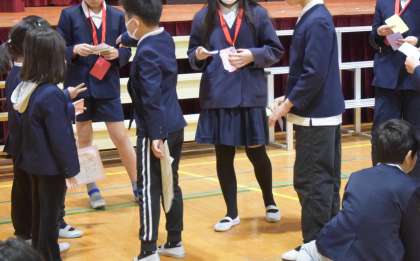 The "Hello Group" (an activity group made up of students from 1st to 6th grade) handed out message cards to the 6th graders to congratulate them on their graduation.