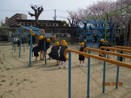 1年生は初めての登校日。校庭の遊具で少し遊びました。