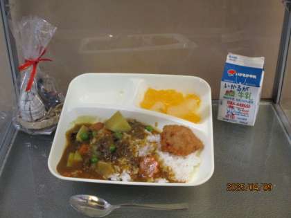 本日第一回目の給食のメニューはカツカレーライス、フルーツゼリーです。
