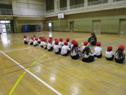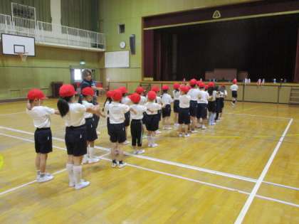 いろいろ場所を変えて「集合」の掛け声にみんなで声をかけながらペアを探して並んでいました。とっても上手に並べていました。