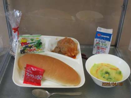 Today's school lunch menu was a popular dish: stewed hamburger steak, corn soup, and soybean kelp. The stewed hamburger steak was thick and very juicy, and the sauce was good, with the fat from the meat melting away, making it very delicious. The corn soup had a deep flavor, with the sweetness of the corn added to the soup. The soybean kelp went very well with the saltiness of the kelp.