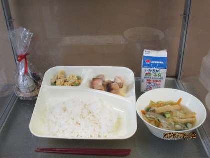鮭のみそ焼き、五目汁、えんどうの卵とじ