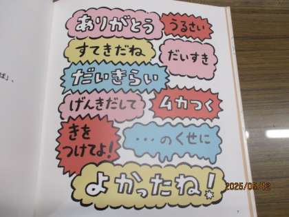 ちくちくことばは使うとどんどん増えていくんだそうです。でも、ふわふわことばも使うとどんどん増えるようです。なので、やはりちくちくことばが出そうになったら、ふわふわことばに変換しなくてはいけません。「うるさい」→「少し静かにしてくれる?」「早く!」→「待ってるよ」などおうちでの会話も少し変換してみてください。
