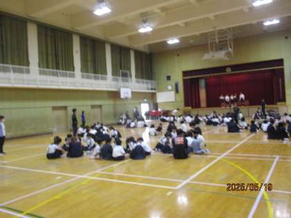 今日の集会は集会委員会が考えたクイズに答えるゲームでした。縦割り班のハローグループで丸くなって、一緒に答えを考えます。上級生が優しくリードしてくれたおかげで、みんなで穏やかに楽しく参加することができました。