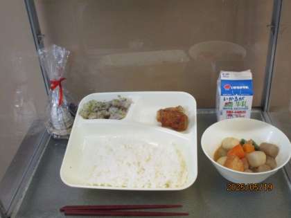 ちくわのいそべ揚げ、あつあげとさといもの味噌煮、キャベツの赤じそあえ、