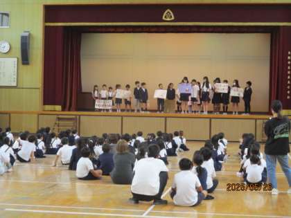 今日の集会は、金曜日に開催するゲームランドのゲームコーナーの宣伝でした。各学級でゲームを考えて、お客さんを楽しませます。ゲームコーナーには、縦割り班のハローグループで回ります。どちらも仲間の協力なしにはうまくいきません。今週は、学習もがんばりつつ、このゲームランドを成功させるべく、みんなで盛り上がっていく一週間になりそうです。
