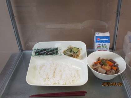 Today’s school lunch featured beef and vegetable simmered stir-fry. The rich flavor of the beef combined with the sweetness of the vegetables made it a delicious dish that went well with rice.