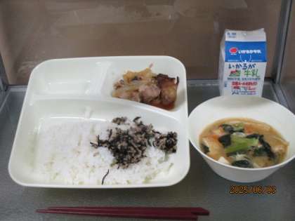 鶏肉の甘辛焼き、みそ汁、魚ひじきそぼろ