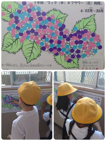 これから1か月間、休み時間等に本を1冊読むごとに、花びらに見立てた色シールを1枚を保健室前に掲示している台紙に貼って、花を完成させていきます。今回完成させる花は、この時期に咲くアジサイです。
