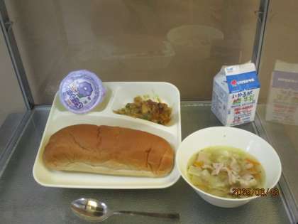 カレーマカロニグラタン、てぼ豆のスープ、ぶどうゼリー