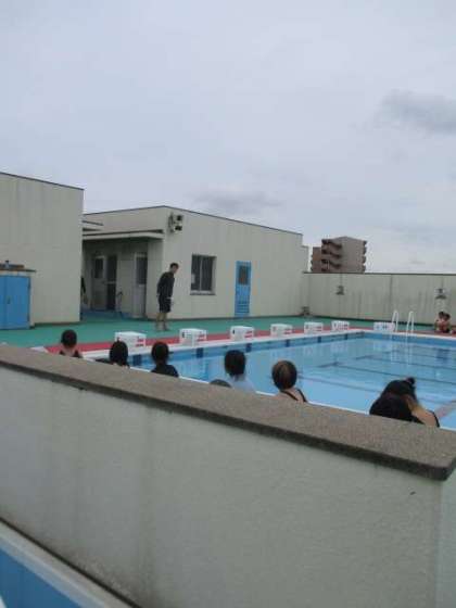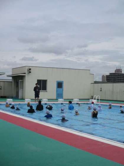 子どもたちにとっては1年ぶりの学校のプールだったので、講堂の屋上に上がってきれいな水がはってあるプールを見て感動していました。