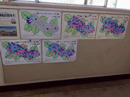 期間は6月末までの1カ月としましたが、想像以上に多くの子が本を読むようになり、合計4枚のあじさいの花が完成しました。1枚につき100〜120枚ぐらいのシールが貼ってあったので、この1カ月で学校全体として500冊ぐらいの本を読んだことになります。今日の児童朝会の最後にこの話をし、この活動を通じて本を読むようになった子がいるか聞いたところ、何人もの子が嬉しそうに手を挙げていました。