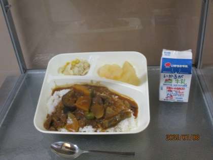 本日の給食には夏野菜カレーライスにナスが使われています。野菜がたくさん入っており、カレールーはとろみがあり、スパイシーでした。