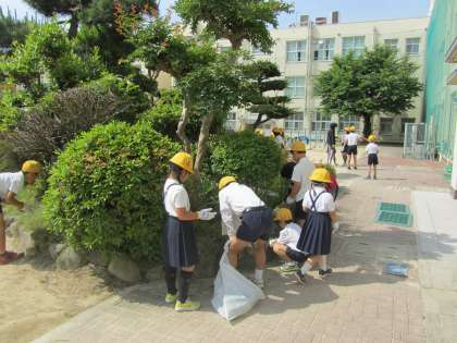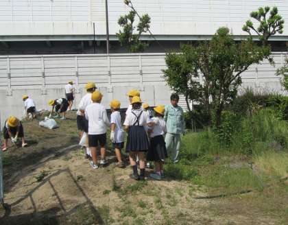 ハローグループという1年生から6年生までが一緒になったグループで行動し、学校の草抜きやゴミ拾いをしました。
