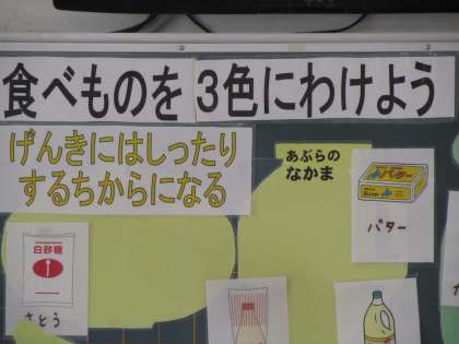 みなさん、学校でもお家でも、3色の食べものをバランスよく食べて