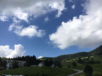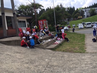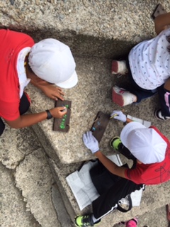 晴天のもと、焼き板の色付けです。『何を描こうかなぁ』と考えながら林間の思い出を描いています。どんな仕上がりになるのでしょうか。