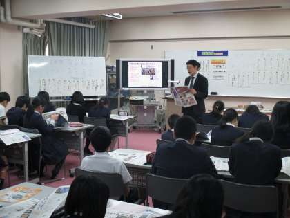 読売新聞から実際の新聞記者の方に来ていただき、新聞の見出しのつくり方や、新聞づくりの仕事について学習しました。