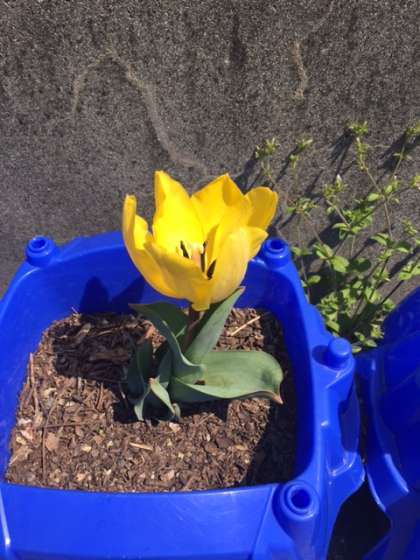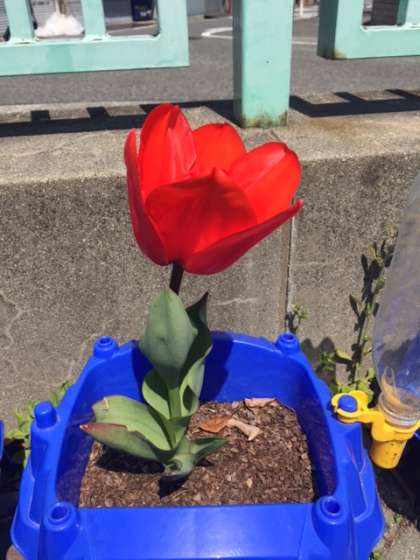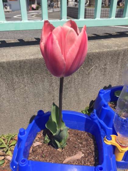 赤、ピンク、黄色と色とりどりのチューリップの花が咲き始めました。