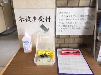 保護者証をお忘れの場合は、玄関入口すぐ右手のところに台がありますので、そちらで必要事項を記入の上、置いてあります入校証を着用ください。また、職員室にお声かけをいただきますようお願いいたします。