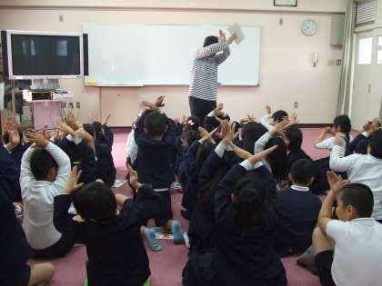 1年生に答えを教えるため、からだ全部を使って表現します。!